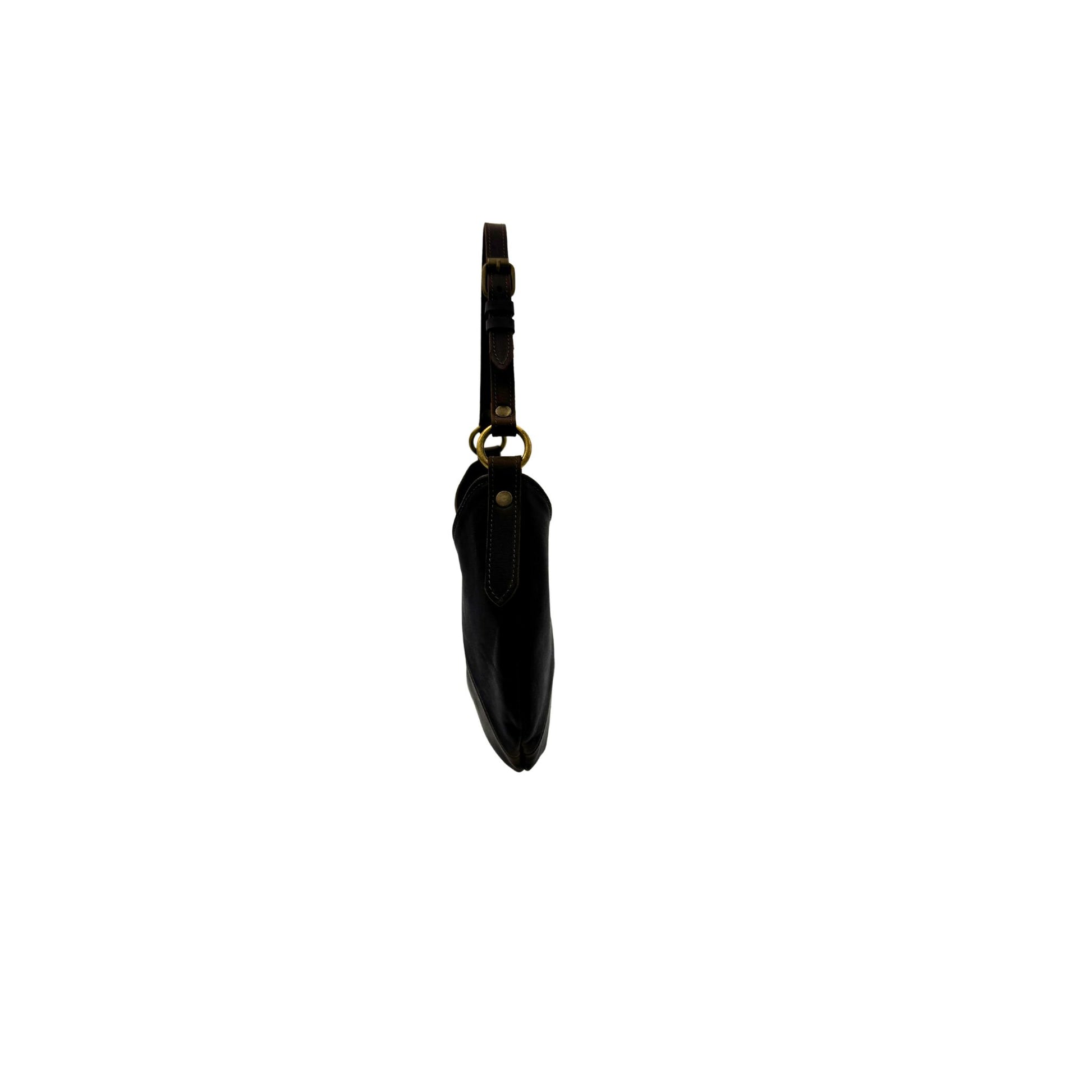 Borsa a spalla compatta e senza tempo, realizzata in cuoio marrone dal carattere deciso e dalla finitura naturale. Le sfumature calde della pelle valorizzano la costruzione artigianale e l’anima essenziale del modello.