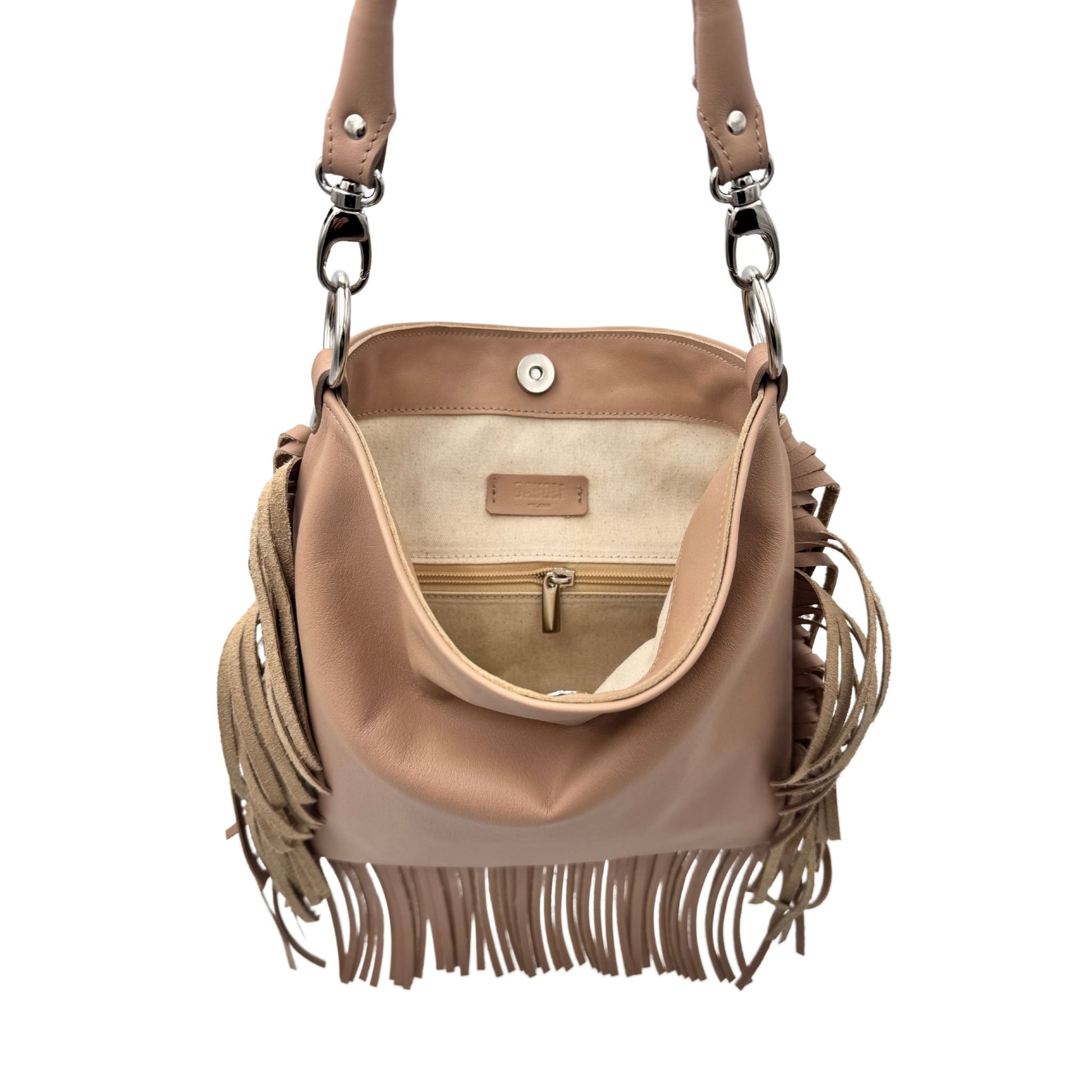 Ispirata alla leggendaria guida nativa americana, questa hobo bag in pelle di vitello beige unisce linee morbide e dettagli western per accompagnare ogni passo con eleganza e forza. Le frange lunghe 14 cm ondeggiano leggere, evocando orizzonti aperti e avventure da vivere.
